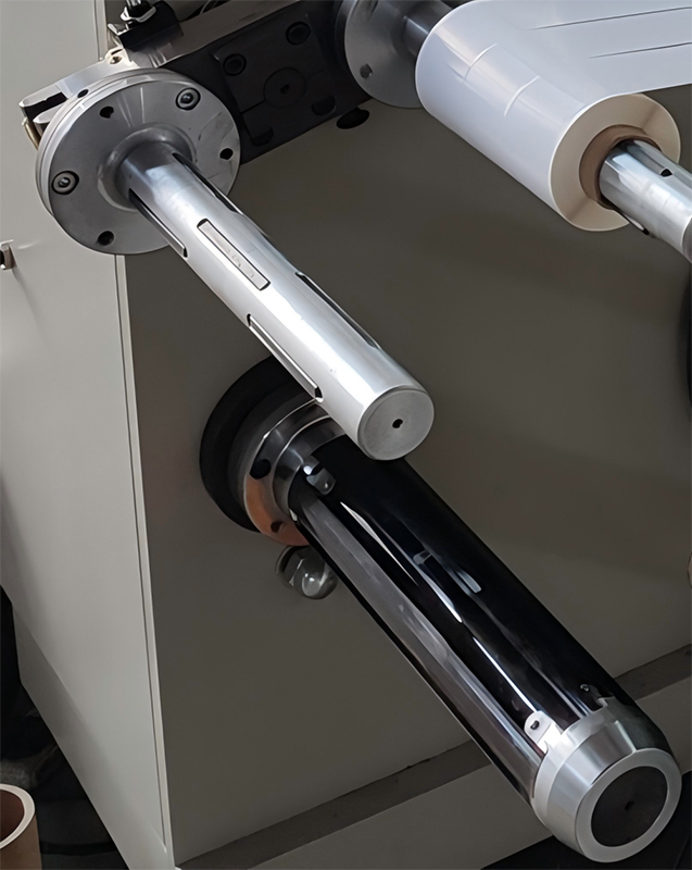 - Elle intègre un système d’arbre pneumatique avec expansion automatique de l’air, assurant un maintien ferme du mandrin pendant les opérations de déroulement et de rembobinage.